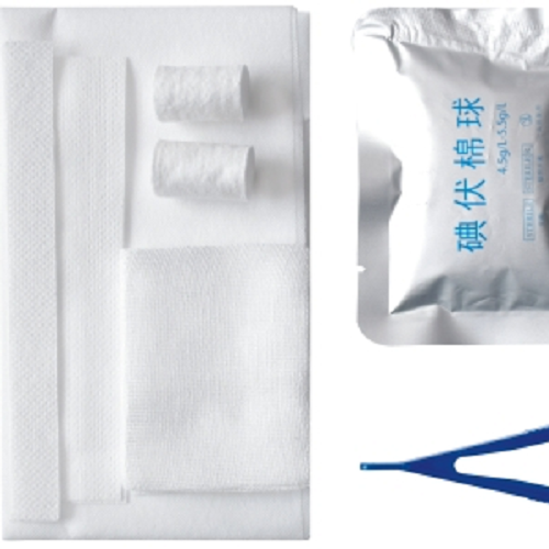 A型由基本组件医用脱脂纱布块、一次性使用医用橡胶检查手套和可选组件一次性使用治疗巾、医用保护套、医用无菌敷贴、透气胶带、医用酒精棉球、医用碘伏棉球、医用酒精棉签、医用碘伏棉签、医用输液贴、医用棉球、医用棉签、一次性使用孔巾、一次性医用垫、一次性使用配药用注射器、检查手套、一次性使用敷料镊、试管、一次性使用灭菌橡胶外科手套、一次性使用无菌手术膜、一次性使用口罩、帽、托盘、医用钳、纱布绷带、包布组成;